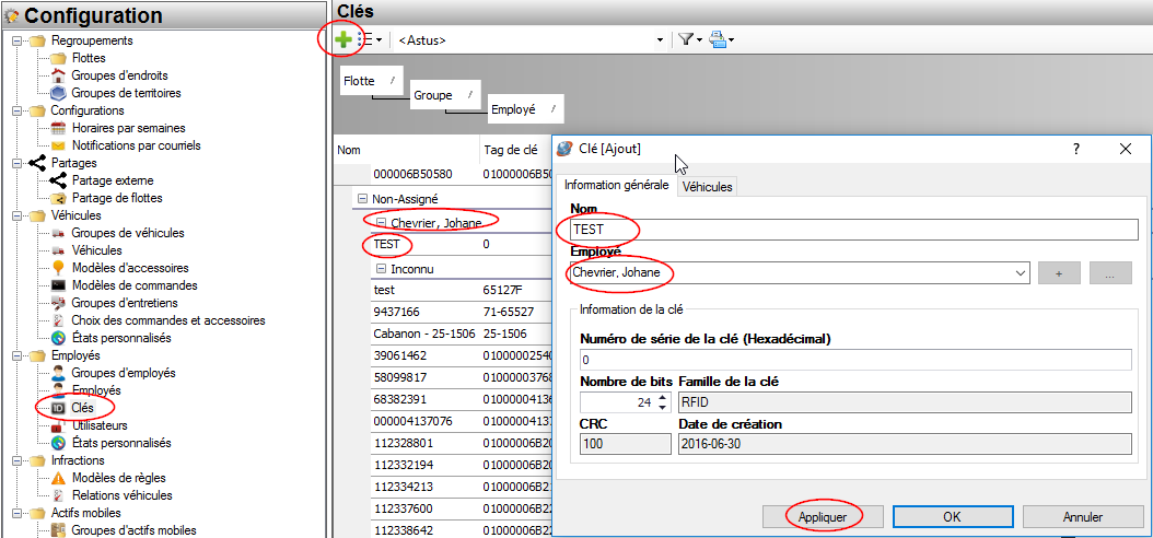 - A l'onglet Information générale, complétez les champs Nom, Employé et ajouter les Information de la clé.