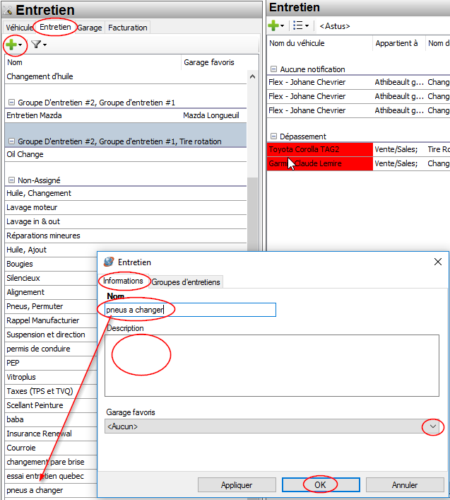 • Écrire le nom de la tâche que vous désirez créer. Dans l'exemple: pneus a changer.