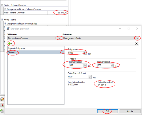 Vous pourriez par exemple, compléter les trois (3) formulaires d'entretien (avec les informations de la Distance, Par date ainsi que les heures moteur) et dans ce cas être avisé du premier échéancier arrivé à terme.