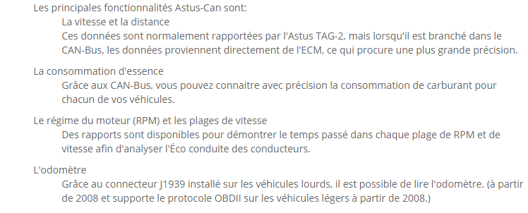 Le module Astus TAG-2 est installé dans le véhicule. Il enregistre et transmet par réseau cellulaire en temps réel une foule de données sur l'état du véhicule ou encore des périphériques avec lesquels il a été jumelé.