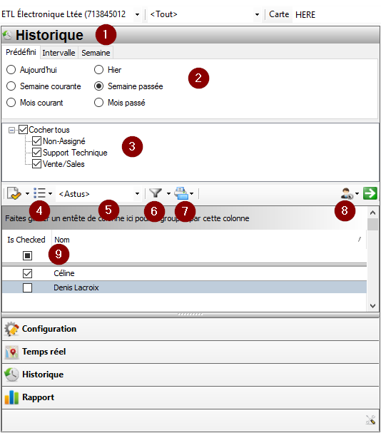 | 6 | Menu pour créer un filtre en fonction de variables. Ce bouton permet de créer un filtre sur l'affichage des véhicules et d'activer ou désactiver le filtre automatique, qui permet de filtrer rapidement chaque colonne en inscrivant une information de recherche sous le nom de la colonne ciblée.Prendre note: Il est recommandé de toujours activer le filtre automatique. |