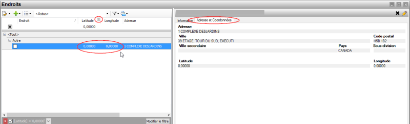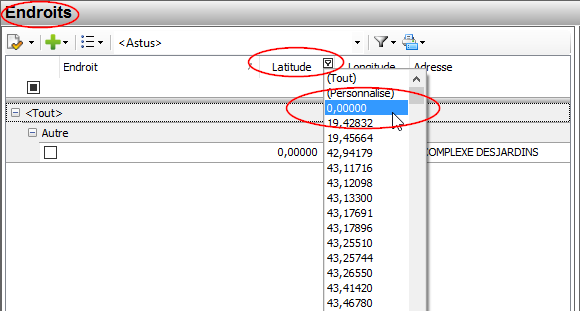 • Pour vous assurer de la validité des entrées, à la fenêtre Endroits, cliquez sur l’entonnoir localisé à coté de la colonne Longitude ou Latitude.