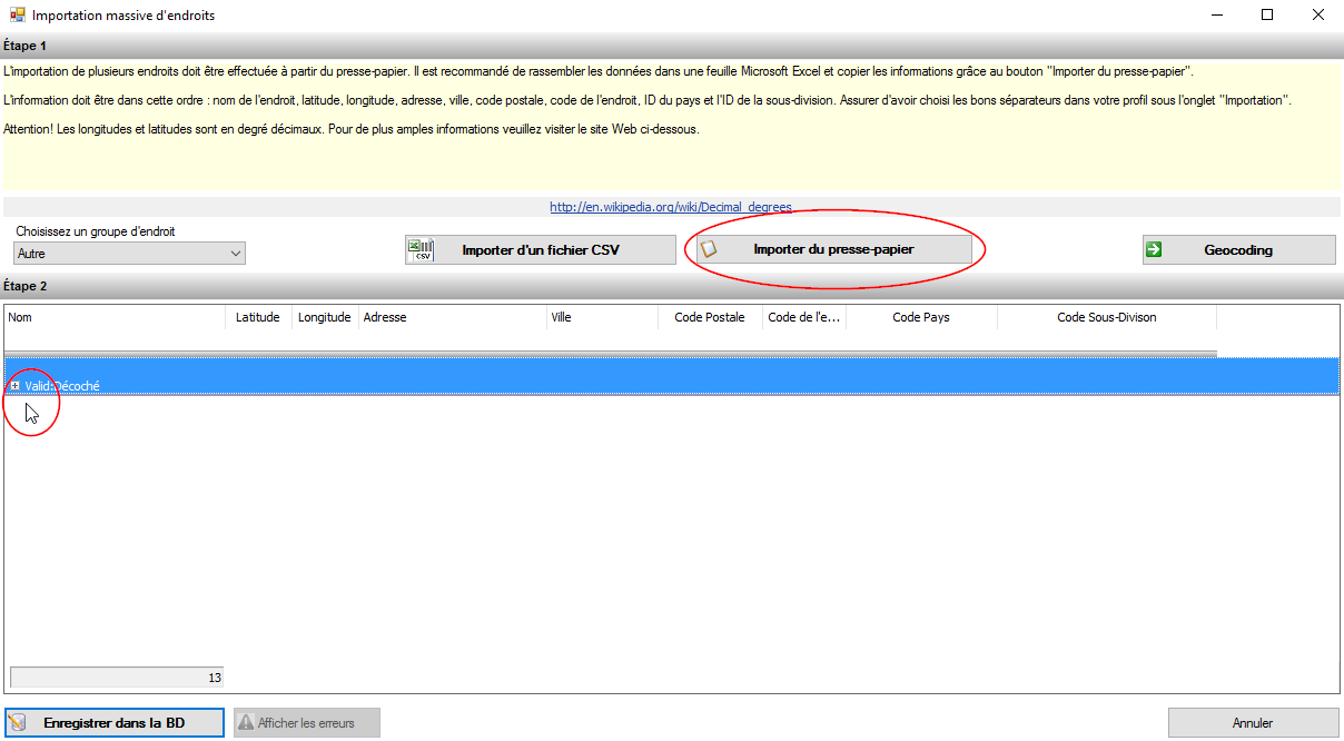 De votre document Excel, copier (Control C sur clavier) les 10 premières lignes de vos endroits à importer incluant les 9 colonnes sans l'entête.