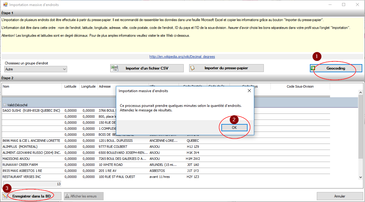 • Cliquez sur Geocoding (1), un message va apparaître vous indiquant que le processus pourrait prendre quelques minutes (2).