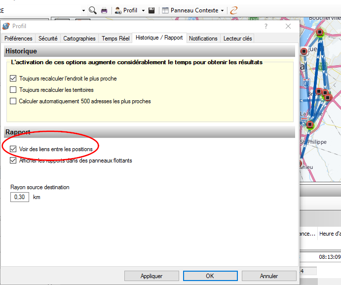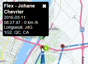 Cette option trace des lignes entre chaque points, la couleur de la ligne représente la vitesse du véhicule entre les deux (2) points. Prendre note que le ligne ne suit pas la route mais est représentée comme en vol d'oiseaux.