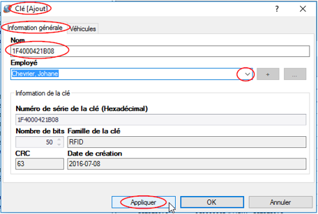- La fenêtre Clé (Ajout) s'ouvre avec le numéro de la clé.