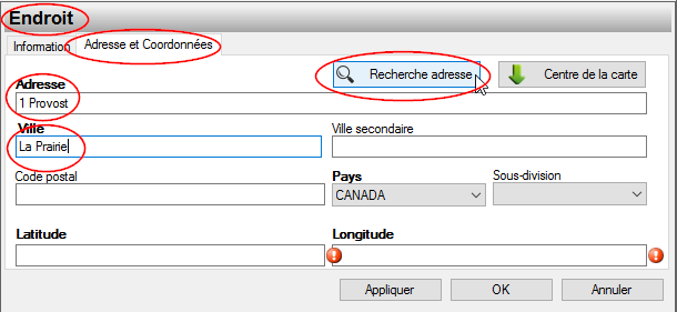 • Allez à l'onglet Adresse et Coordonnées et complétez les informations connues de l'adresse, la ville et le code postal. (Deuxième illustration à droite)