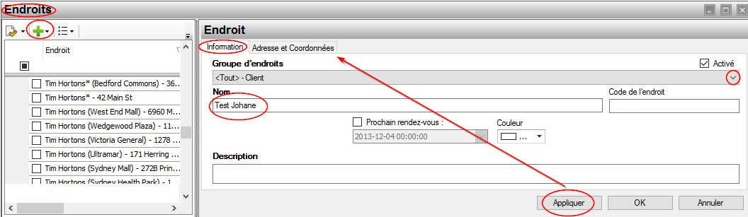 • Complétez les champs Groupe d'endroits s'il y a lieu et le Nom de l'endroit.
