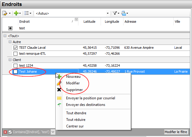 Si vous désirez modifier ou supprimer des endroits, vous pouvez cliquer sur l'endroit avec le coté droit de la souris. (Dernière illustration à droite)