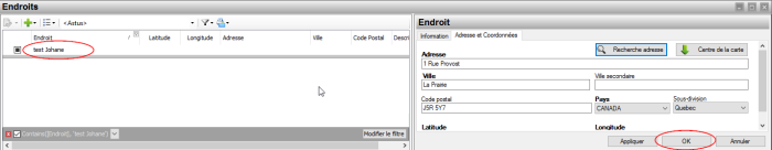 • Vous devez cliquer sur OK dans la fenêtre précédente pour compléter la création de l'endroit.