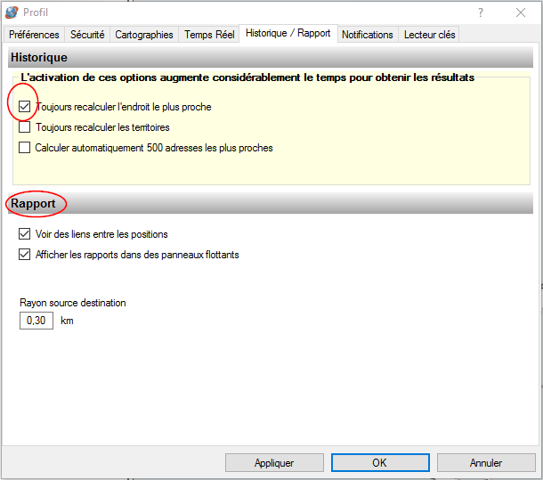 - Il est recommandé de cocher la case Toujours recalculer l'endroit le plus proche.