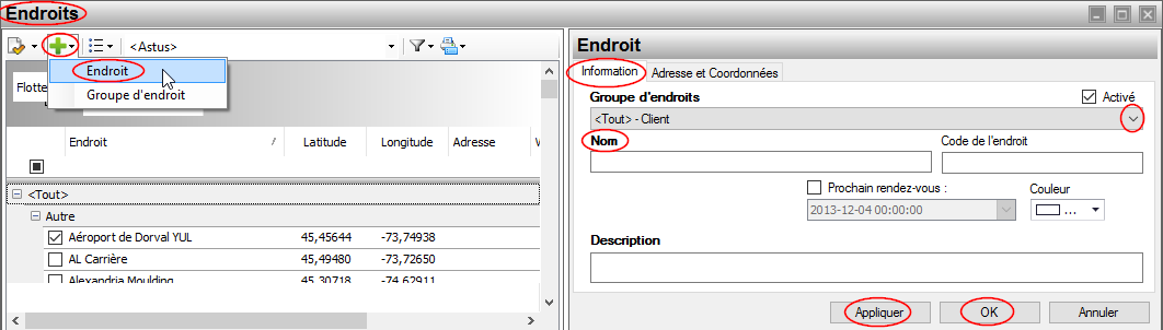 et choisir Territoire. - Une fenêtre s'ouvre à droite et compléter les champs groupe de territoire et le nom de l'endroit.
