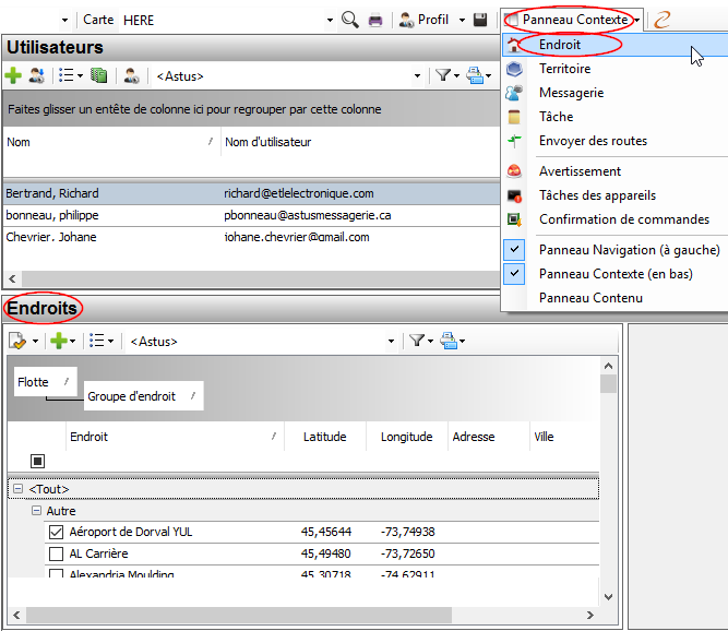 - Cliquer sur le menu déroulant du Panneau Contexte localisé dans l'entête du logiciel Astus.