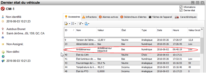 - Dans la section Temps Réel, cliquez sur le véhicule (CM-1) pour lequel vous désirez activer ou désactiver la fonction anti démarreur avec le coté droit de la souris.