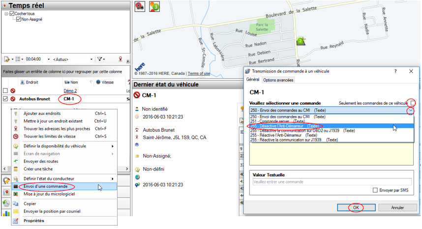 - Choisir Envoi d'une commande, une nouvelle fenêtre s'ouvre avec le nom du béhicule CM-1. Décochez la case Seulement les commandes de ce véhicule. A L'aide du menu déroulant, choisir 255-Désactive l'anti-démarreur (texte) ou 255-Réactive l'anti-démarreur (texte).