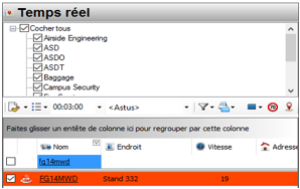Dans la section Temps Réel, si une alarme est déclenchée, vous êtes informés par l'apparition d'une ligne orange précédé du symbole d'un gyrophare sur un de vos véhicules.