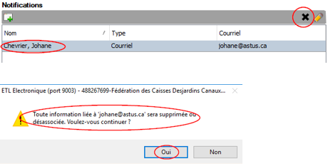 • Pour supprimer l'envoi de ce courriel, cliquez sur le nom à éliminer et cliquez sur le X.