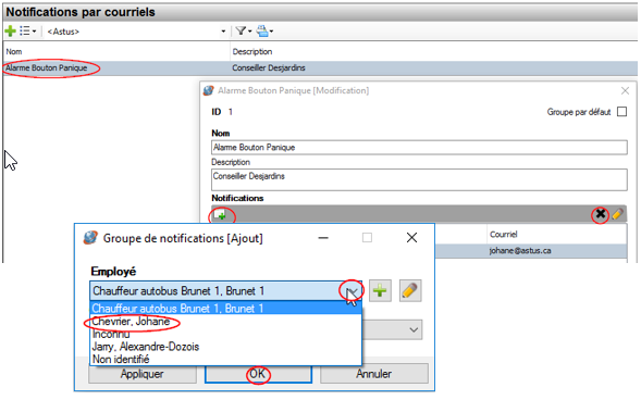 • Dans Configuration, allez à Notification par courriels pour ajouter le destinataire. À l'aide de l'icône ajoutez le nom de l'employé qui recevra le courriel de l'alarme avec le choix des noms d'employés crées préalablement et se retrouvant dans le menu déroulant et cliquez sur OK.