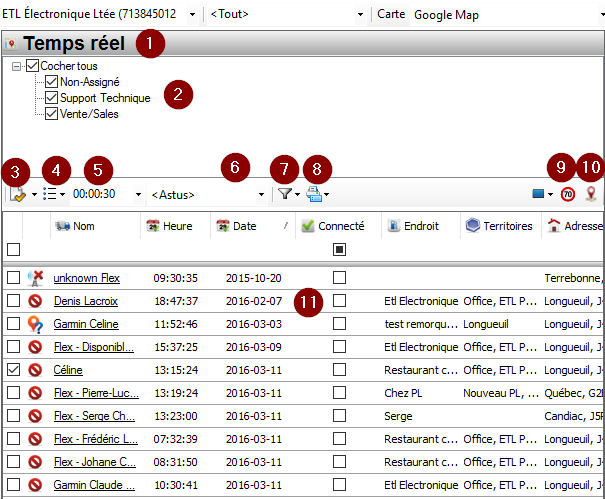 | 11 | Liste de vos véhicules. Pour localiser un véhicule sur la carte, cocher la case correspondant au véhicule dans la liste. La carte se centre alors sur les dernières coordonnées du véhicule. |