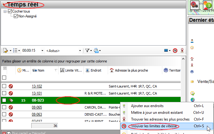 - Dans la section Temps Réel, dans la grille à gauche de votre écran, visualisez le véhicule pour lequel vous désirez trouver les limites de vitesse. (Dans l'exemple de droite, vous désirez trouver la limite de vitesse du véhicule numéro 15 qui circule sur la route.)