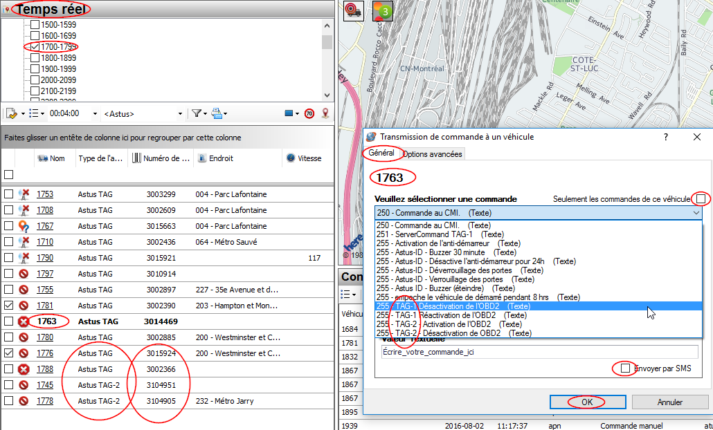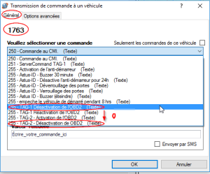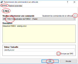 • Choisir Envoi d'une commande, une nouvelle fenêtre s'ouvre avec le nom du véhicule 1763. Décochez la case Seulement les commande de ce véhicule. À l'aide du menu déroulant, choisir 255-TAG-1 ou TAG-2 Réactivation de l'OBD2, cochez la cases SMS et cliquez sur OK.
